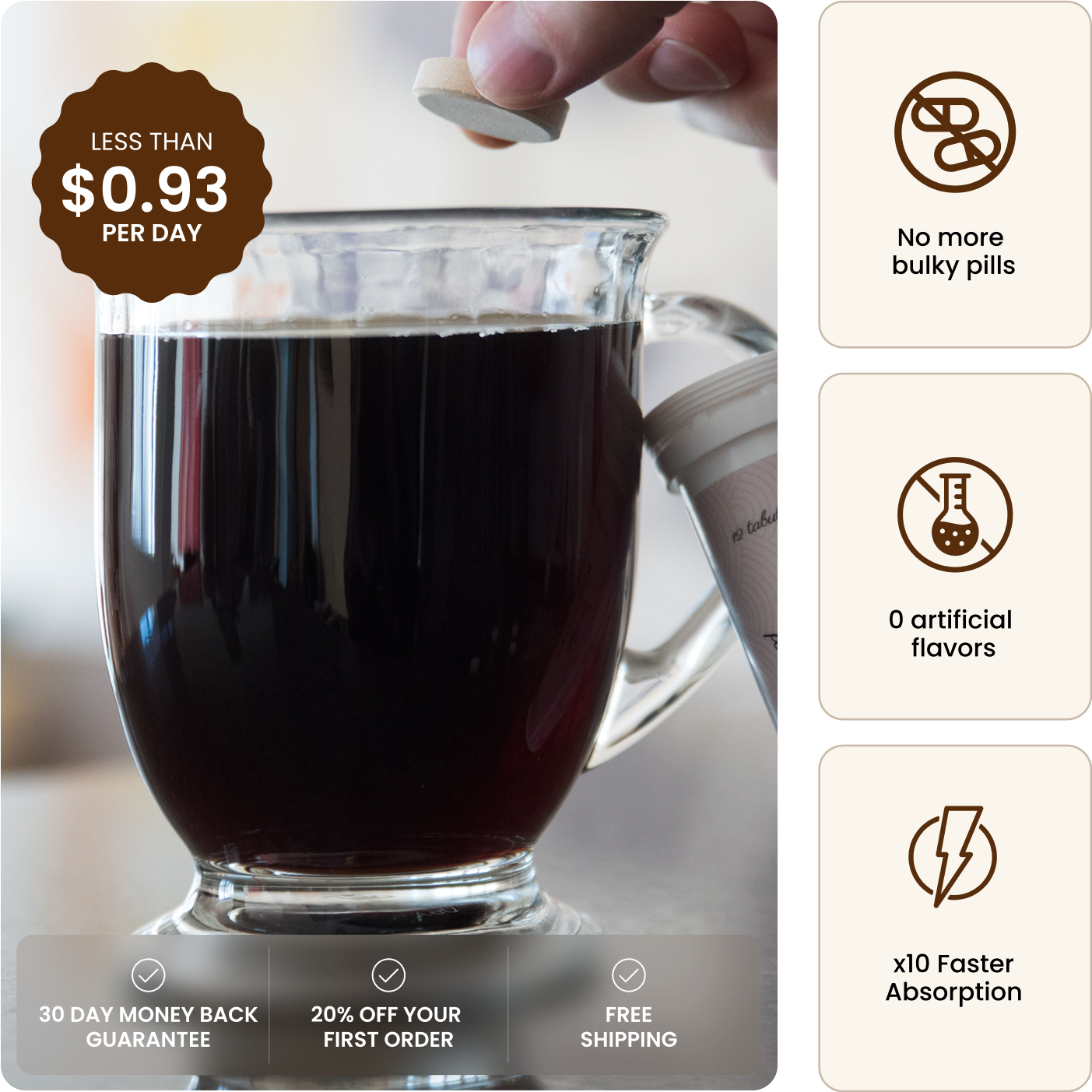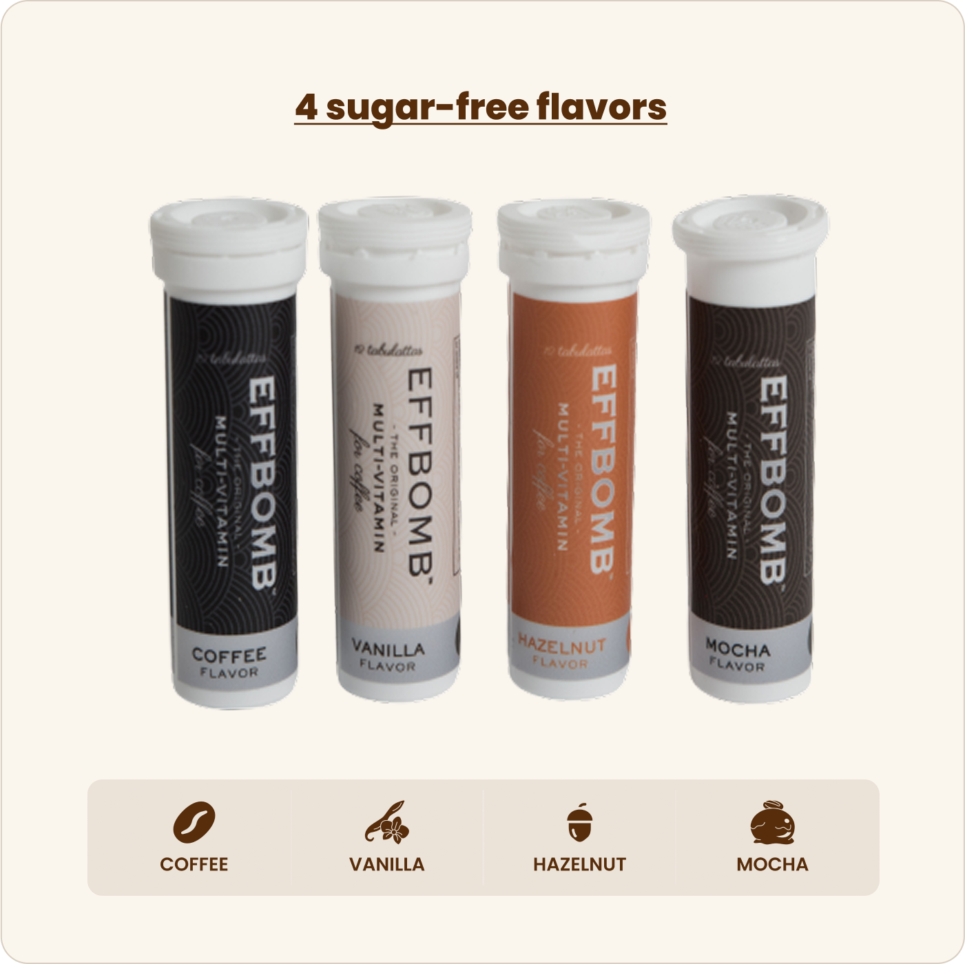EFFBOMB is a rapidly dissolving tablet that flavors and fortifies your coffee.