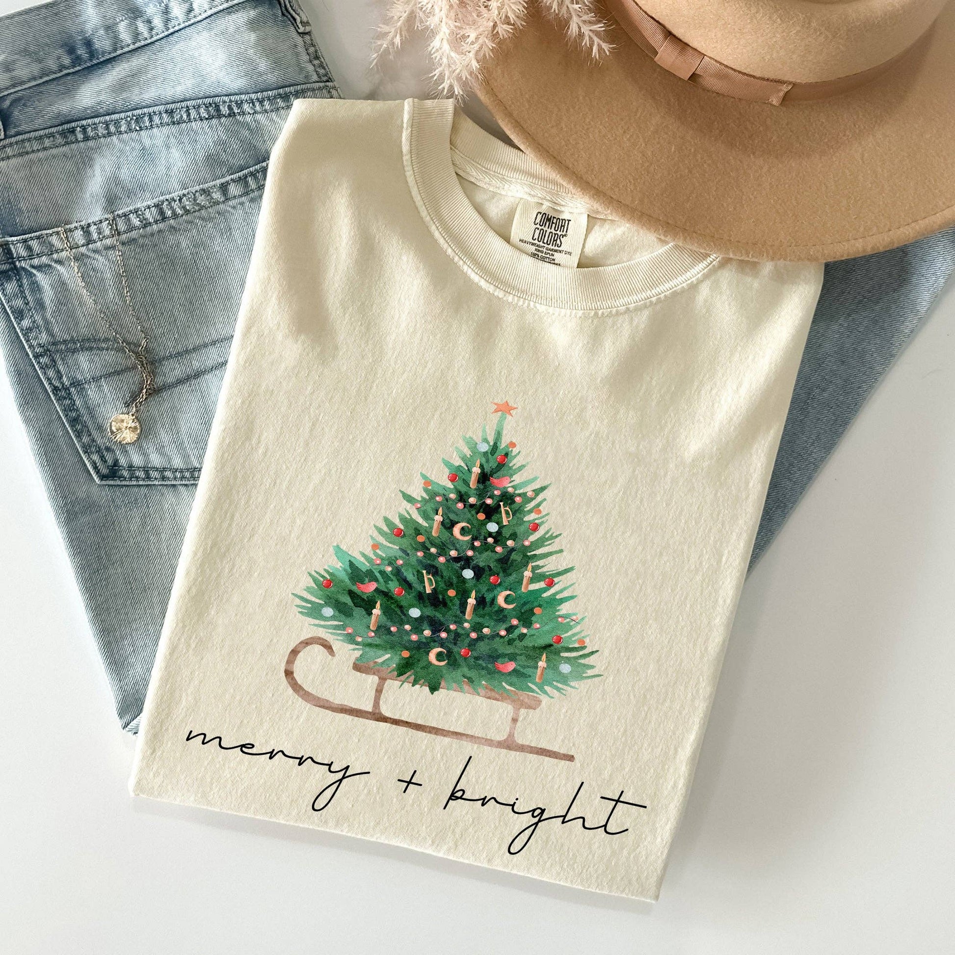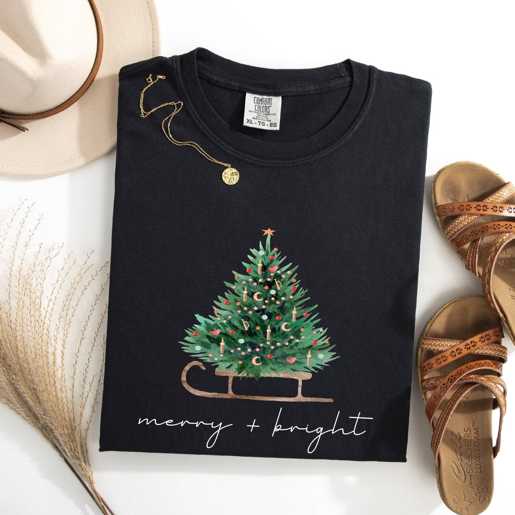 Merry and Bright, Sleigh, Christmas Tree, Snow, Xmas Tshirt