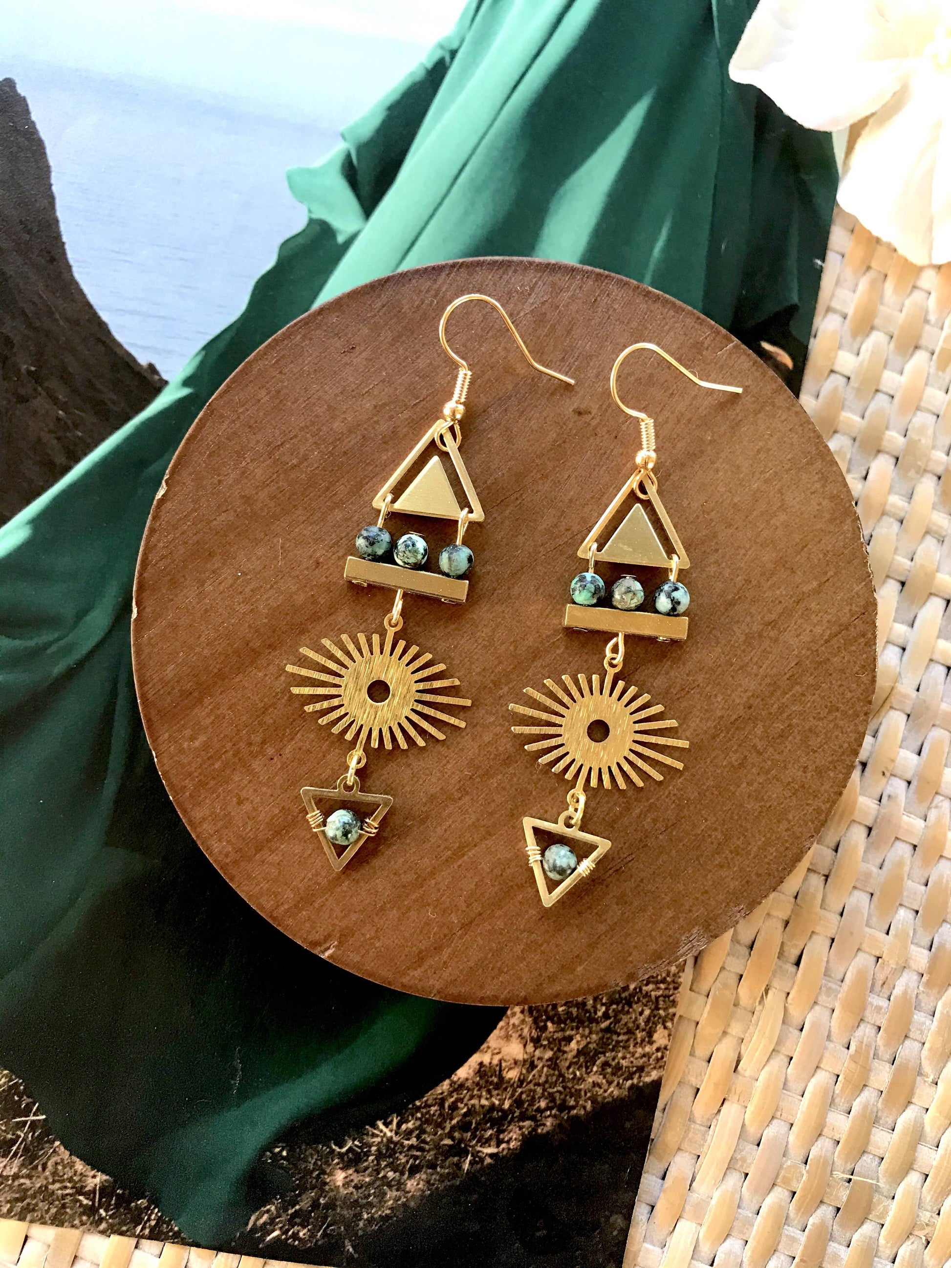These unique, wire wrapped, bohemianهتdangle earrings were made using raw brass geometric shapes, gold plated sunburst connectors,هتand African Turquoise beads. They measure approximately 3.0" inches in drop length, and about 1.0" inches across their widest point.Each pair is made to order and wire wrapped by hand. The fishhooks are hypoallergenic, gold plated, stainless steel.Please see my other listings for all styles within this collection.