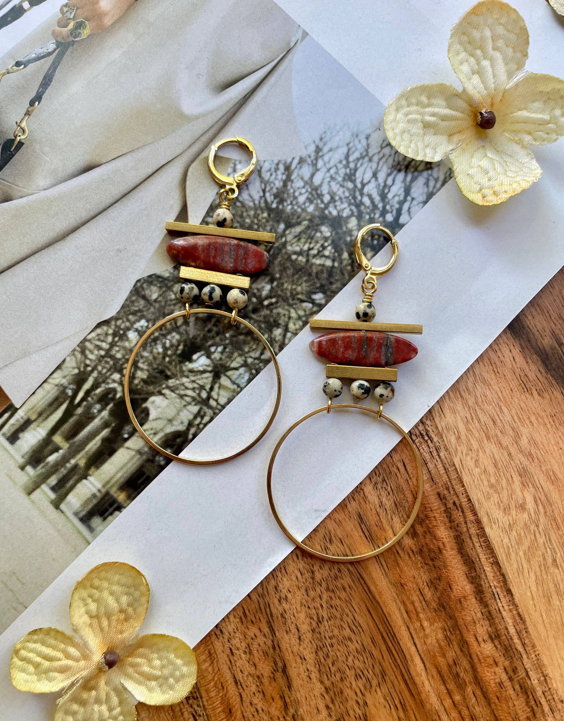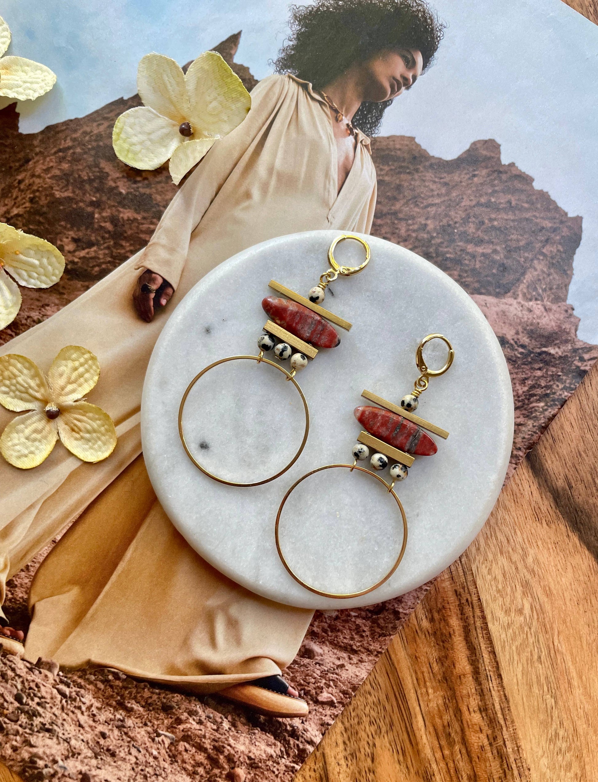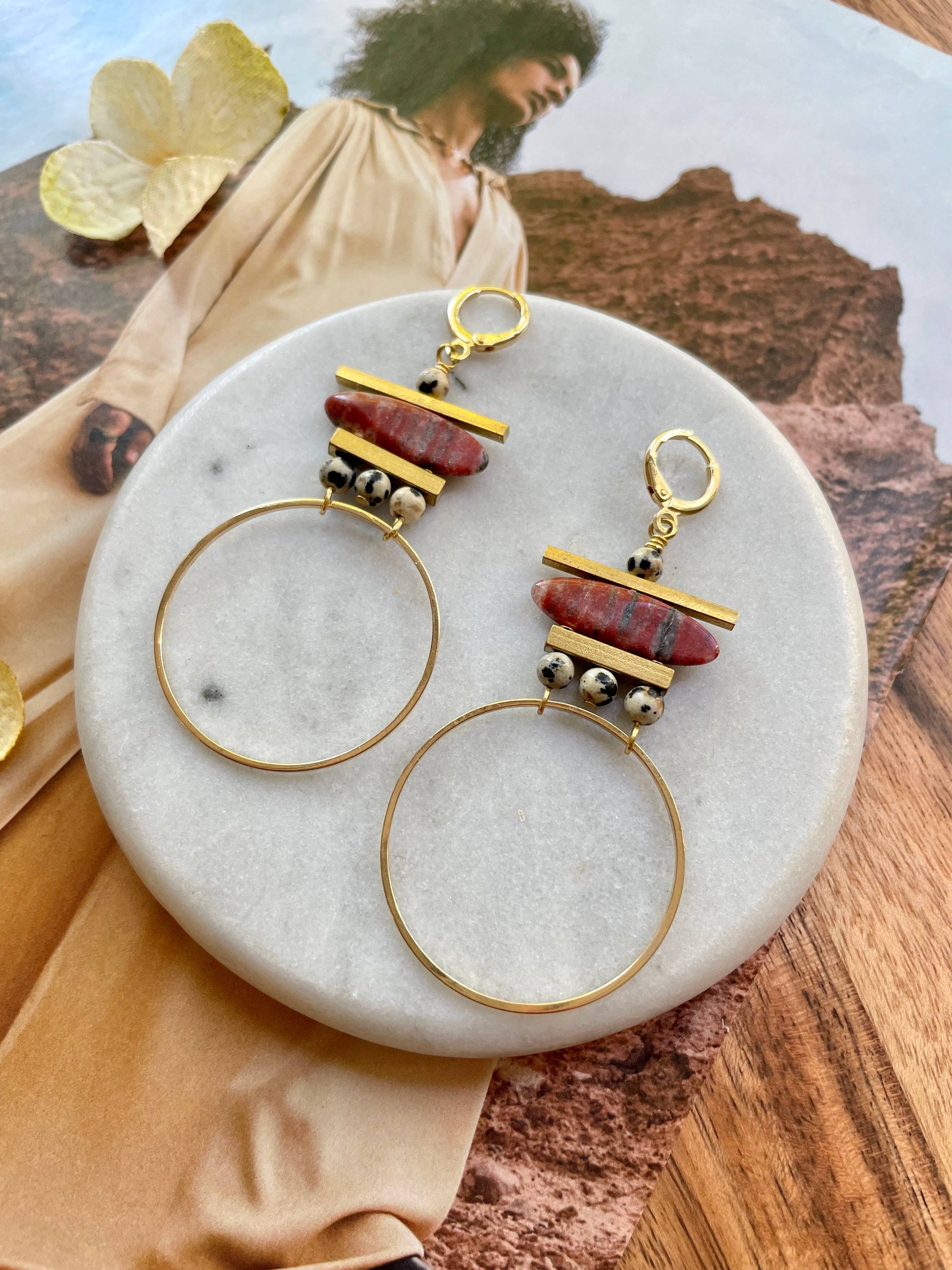 These are large, beaded, bohemian statement hoops featuring genuine red jasper rice beads, dalmatian jasper, raw brass bar beads and 35mm gold plated hoops.