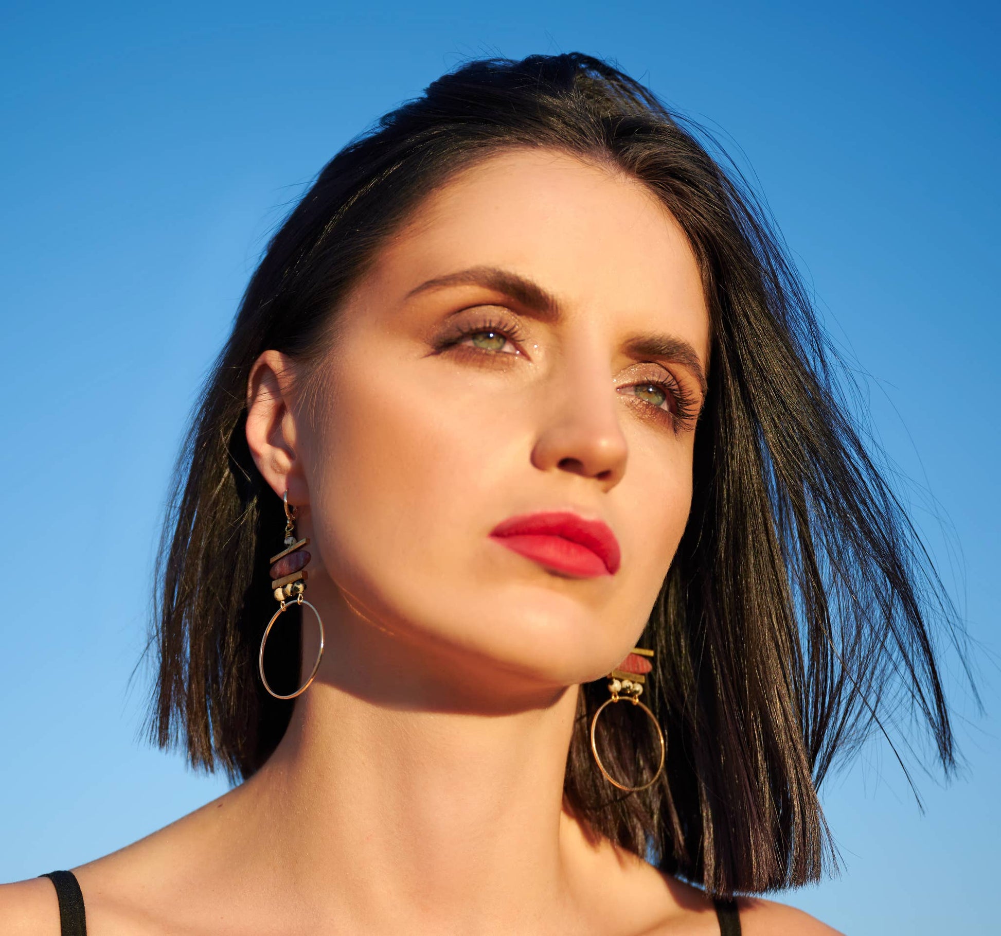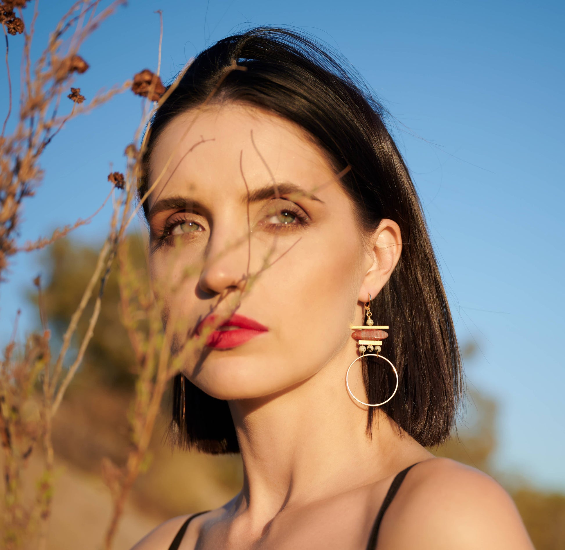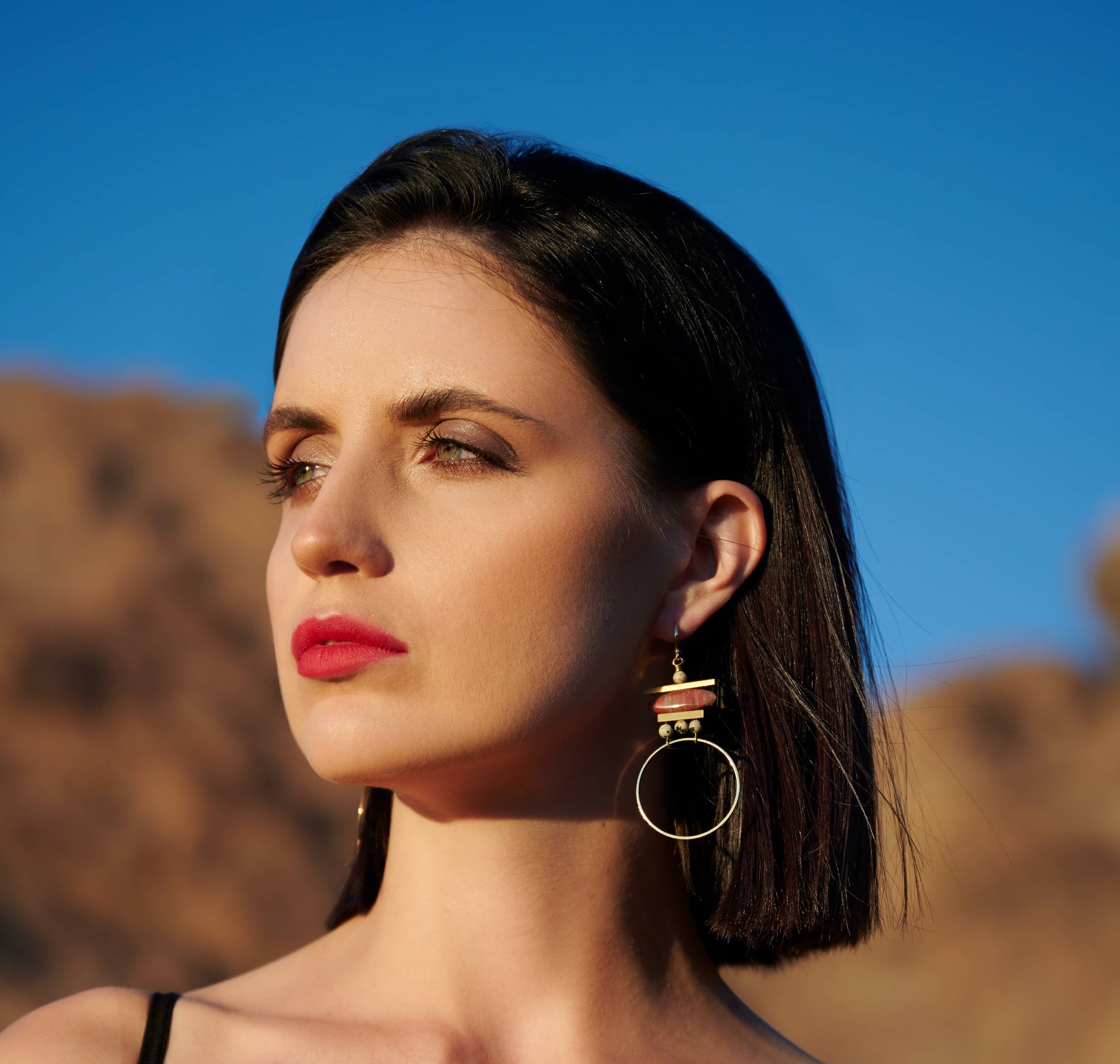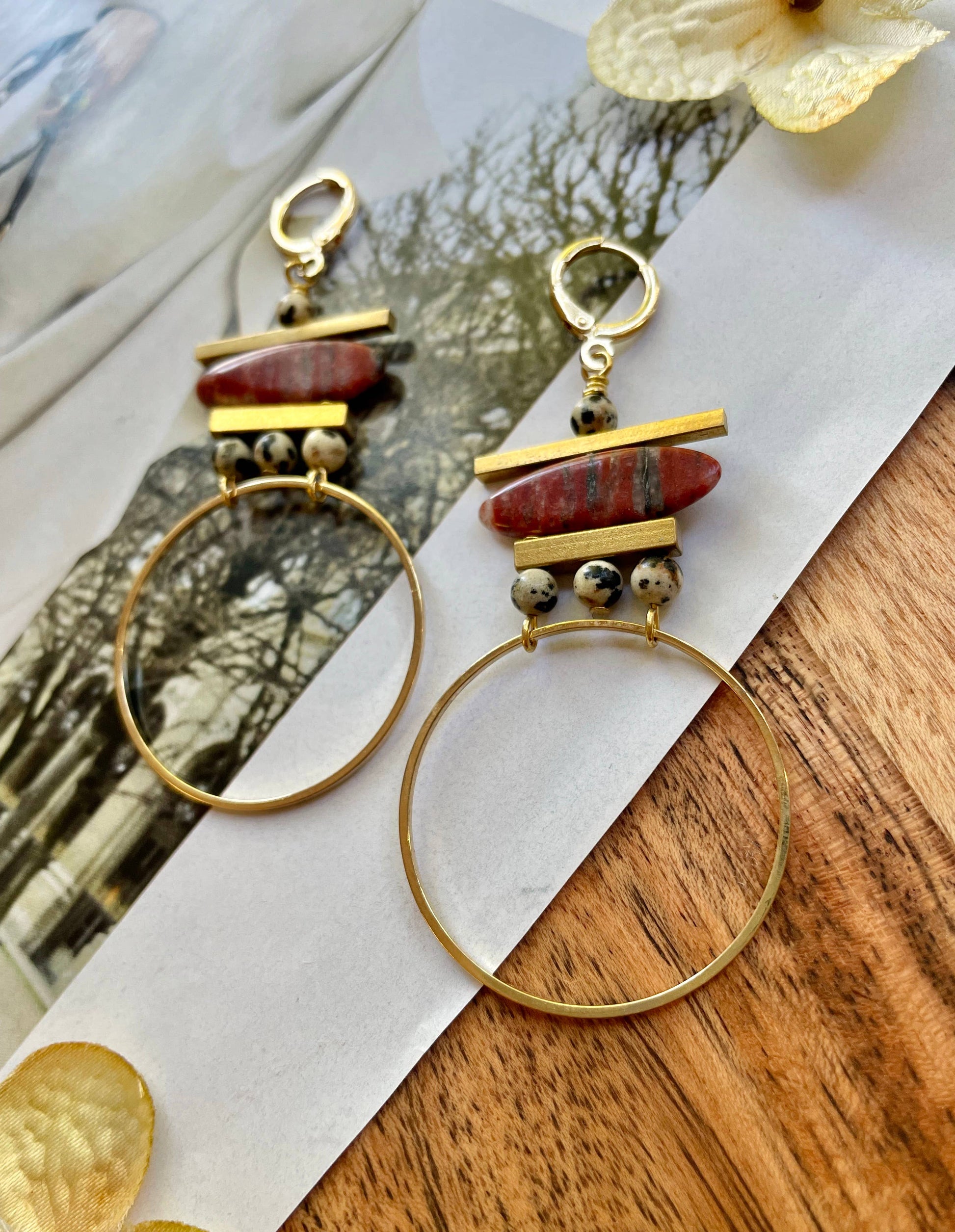 These are large, beaded, bohemian statement hoops featuring genuine red jasper rice beads, dalmatian jasper, raw brass bar beads and 35mm gold plated hoops.