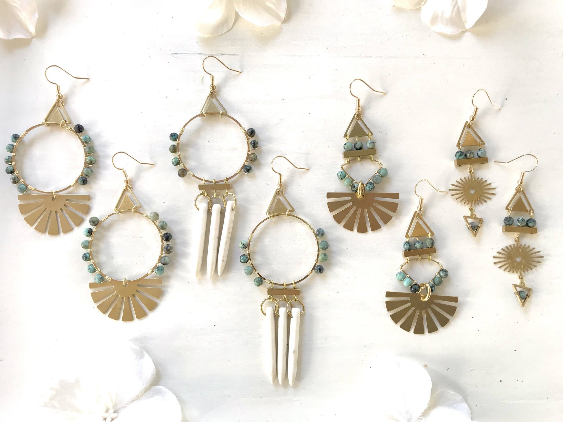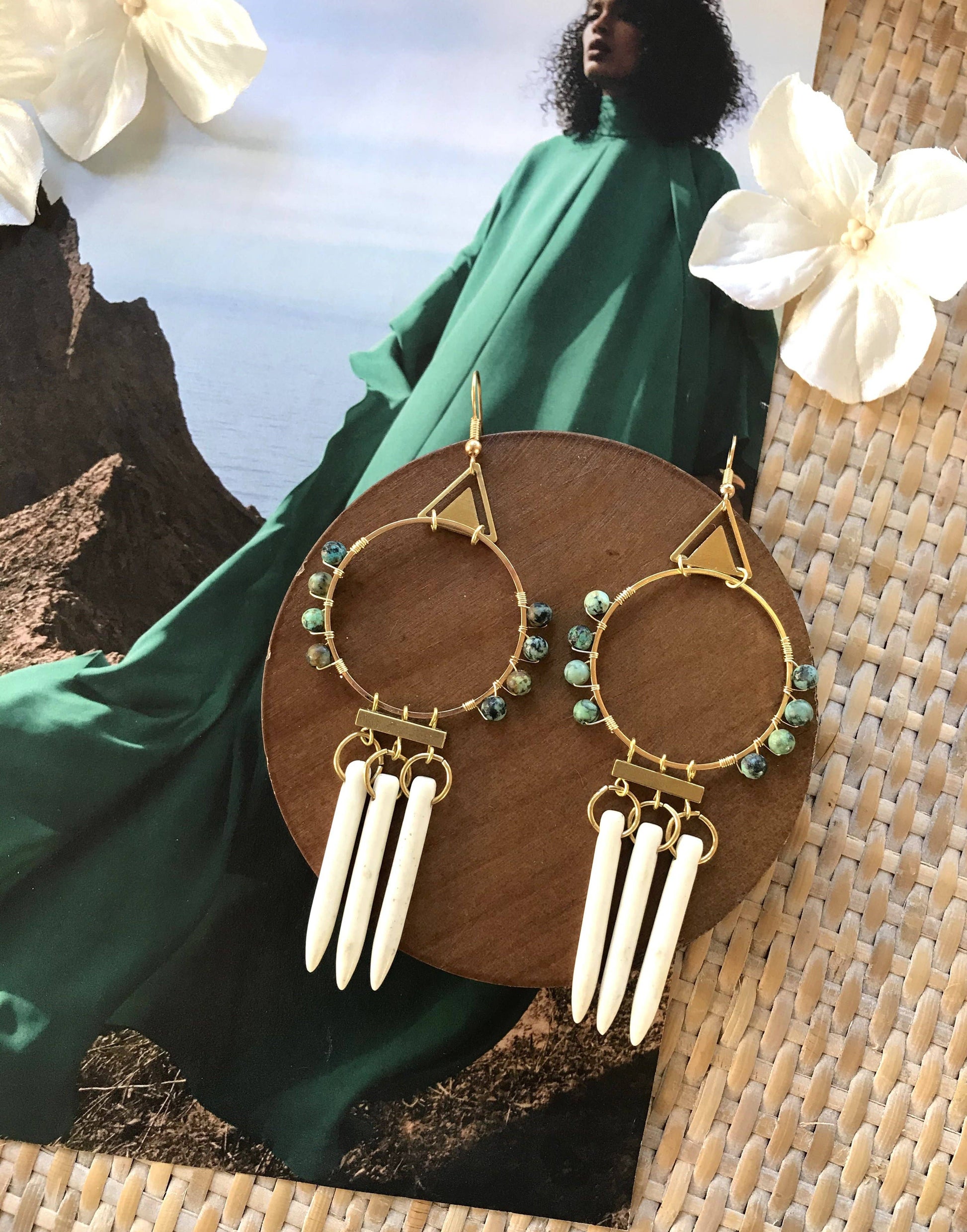 These unique, wire wrapped, bohemian hoop earrings were made using raw brass geometric shapes, long white magnesite pendants, and African Turquoise beads. They measure approximately 4.50" inches in drop length, and about 1.50" inches across their widest point.Each pair is made to order and wire wrapped by hand. The fishhooks are hypoallergenic, gold plated, stainless steel.Please see my other listings for all styles within this collection.