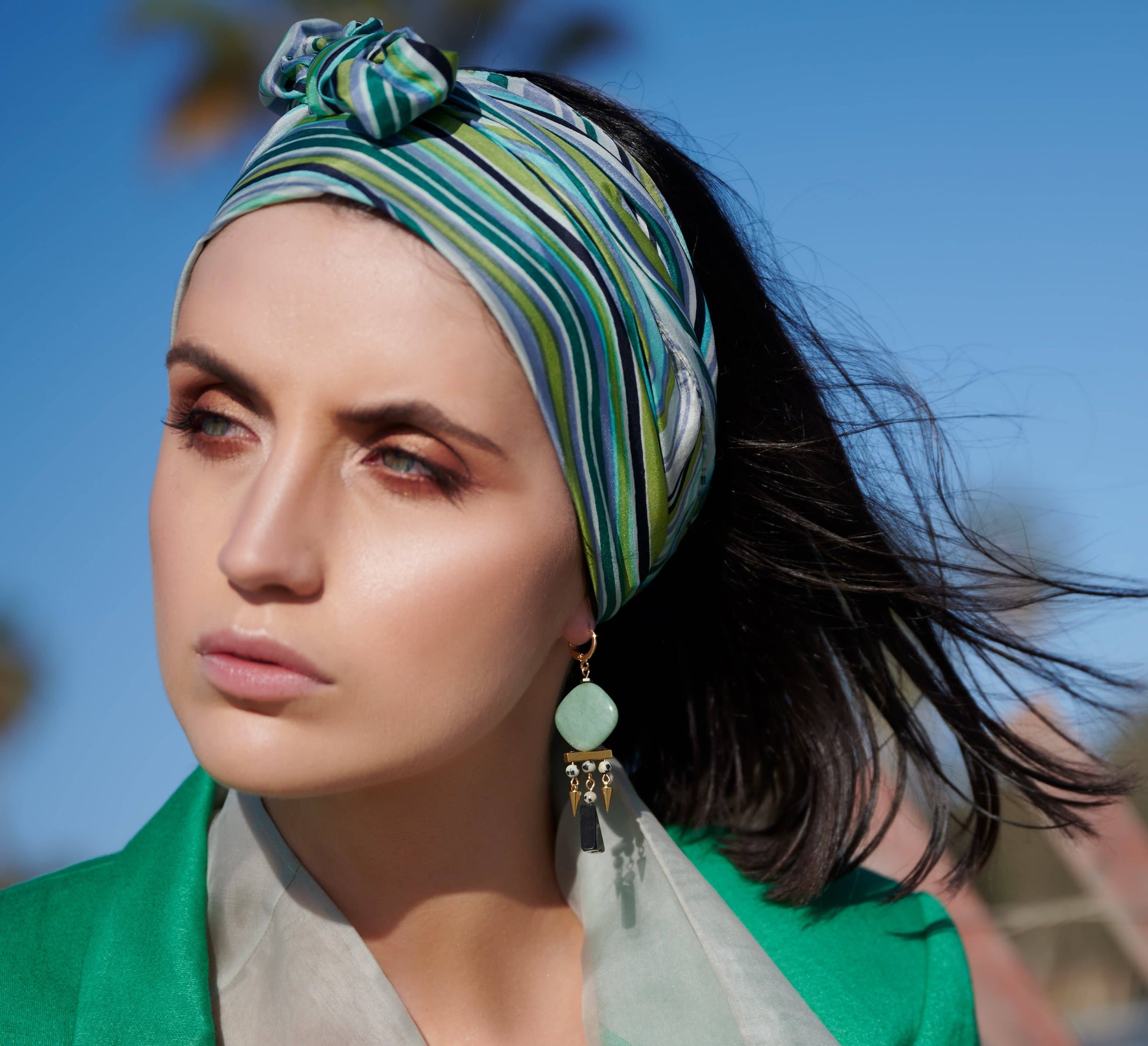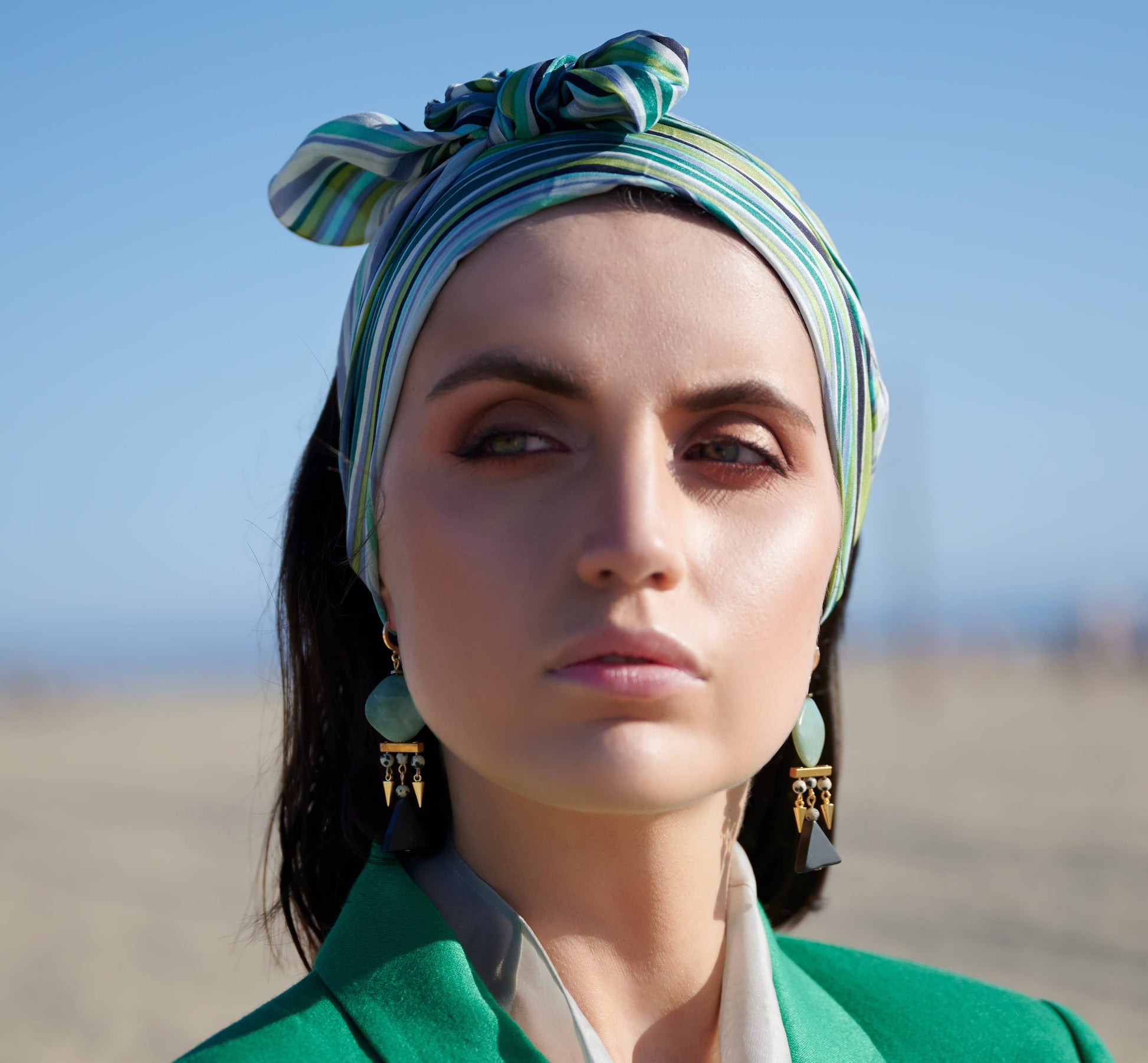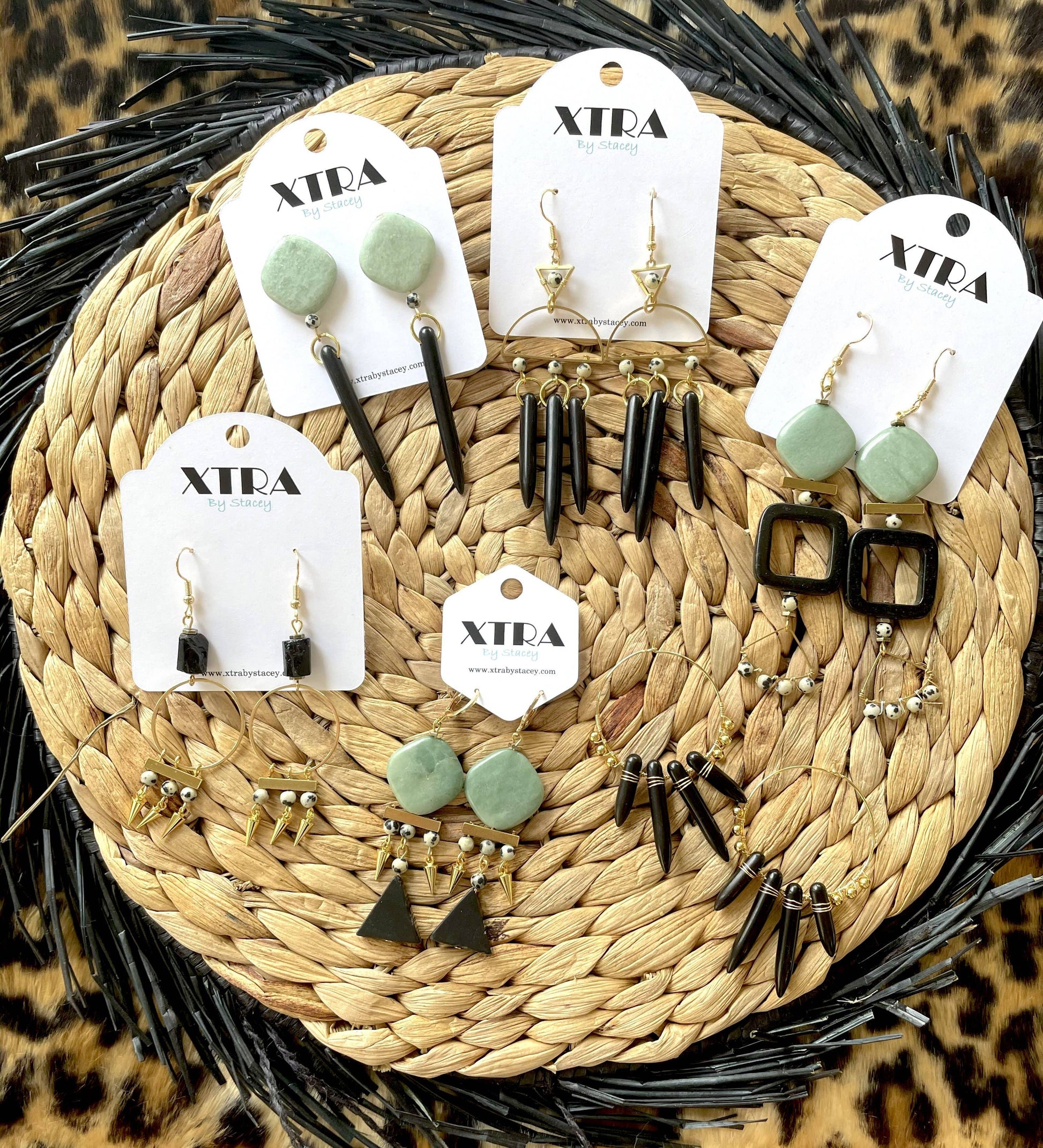 This listing is for chunky beaded gemstone statement earrings featuring square green jade beads, 4mm dalmatian jasper round beads, brass metallic beads, gold plated spikes, and black stone triangles.These earrings hang approximately 2.9" inches from the lobe and measure about 0.75" inches across their widest point. The leverback closures are real gold plated and nickel-free. These earrings are semi-lightweight and suitable for everyday wear.Please see my other listings for all styles within this collection.