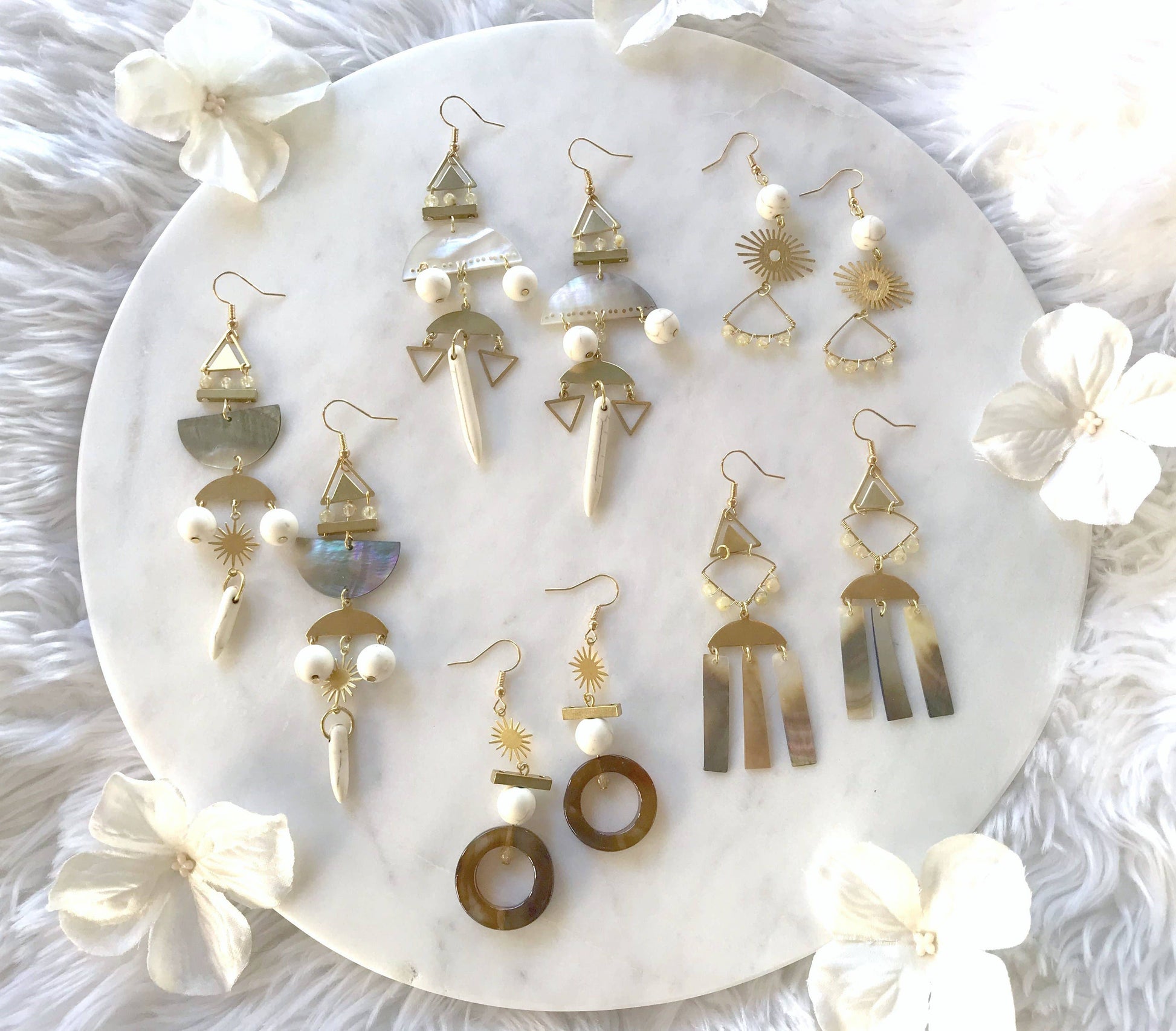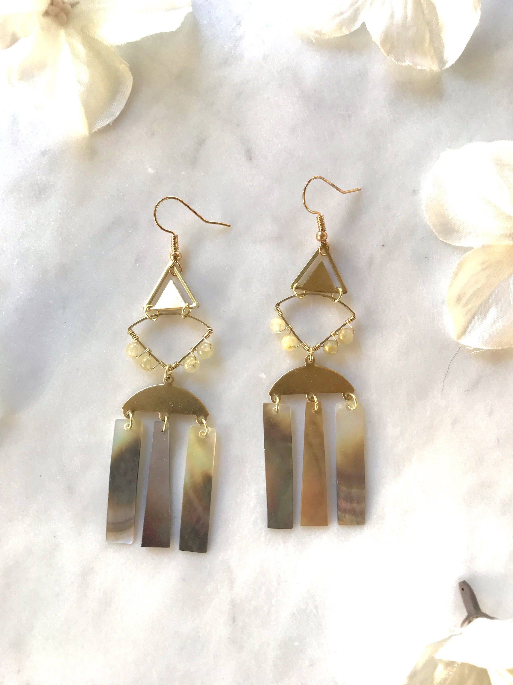 These are unique, boho, chandelier statement earrings featuring genuine shell pendants, wire wrapped natural golden rutile quartz beads, and raw brass geometric shapes.These earrings hang approximately 3.5" inches from the lobe and measure about 0.75" inches across their widest point. The fishhooks are hypoallergenic, gold plated stainless steel.Please see my other listings for all styles within this collection.