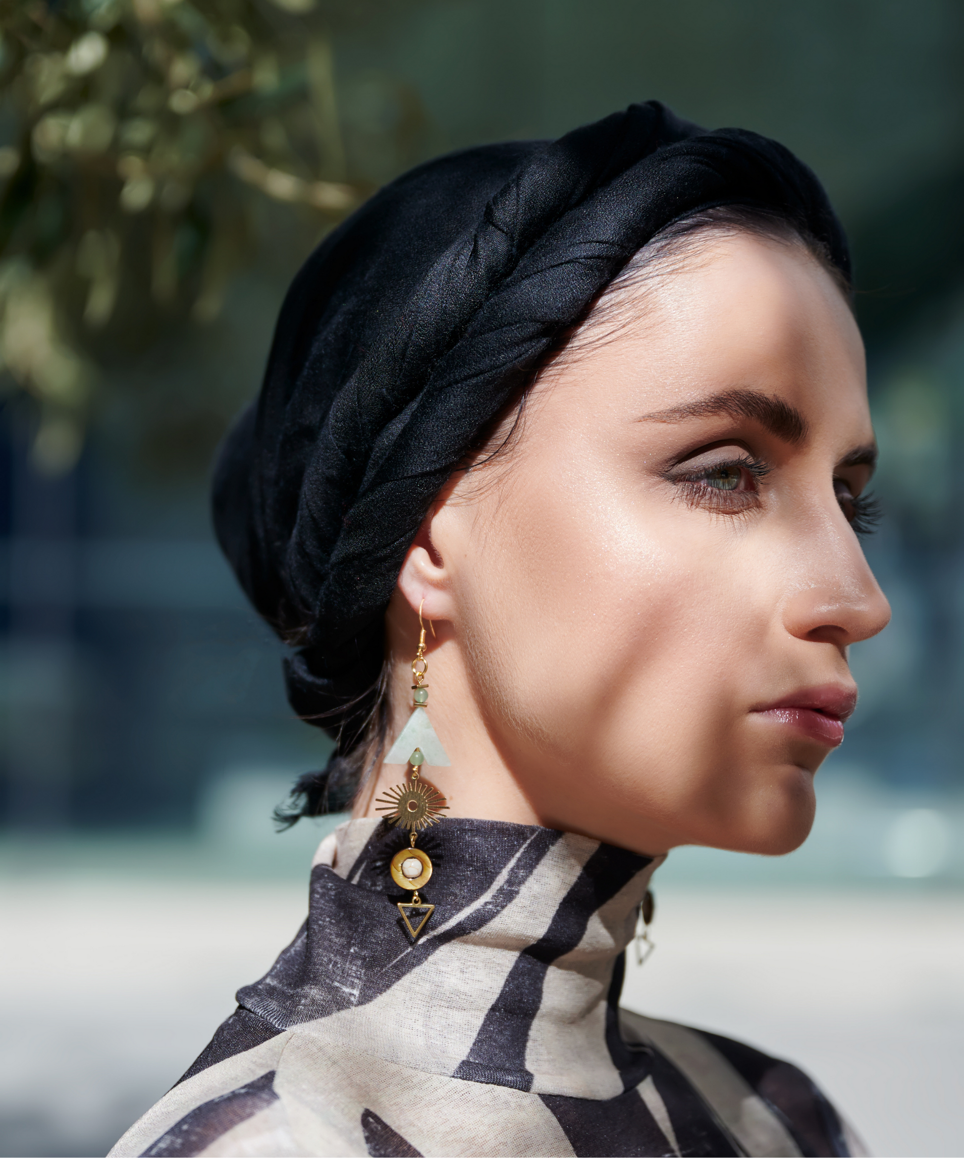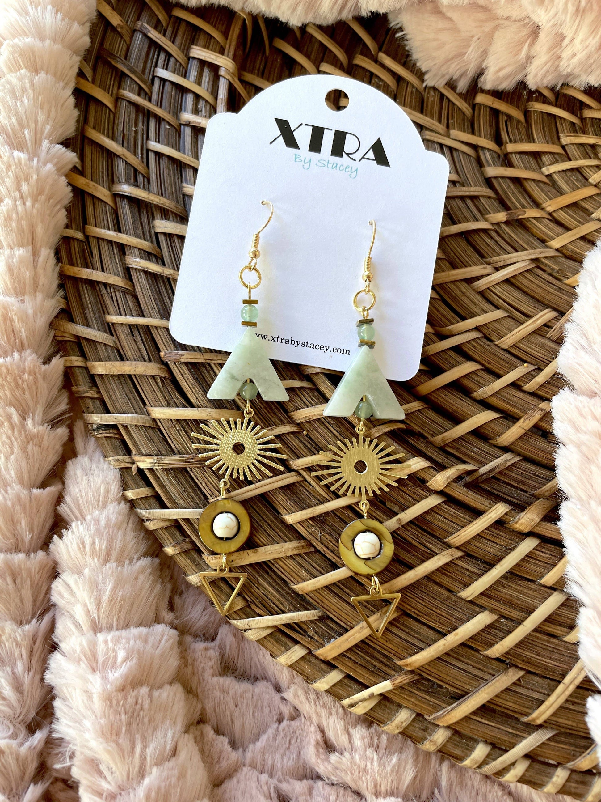 This listing is for beaded geometric boho statement earrings featuring triangular green jade beads, 4mm aventurine round beads, brass metallic beads, gold plated connectors and amber mother-of-pearl coin beads.These earrings hang approximately 4.0" inches from the lobe and measure about 0.75" inches across their widest point. The fishhook closures are real gold plated and nickel-free. These earrings are lightweight and easy for everyday wear.Please see my other listings for all styles within this collection.