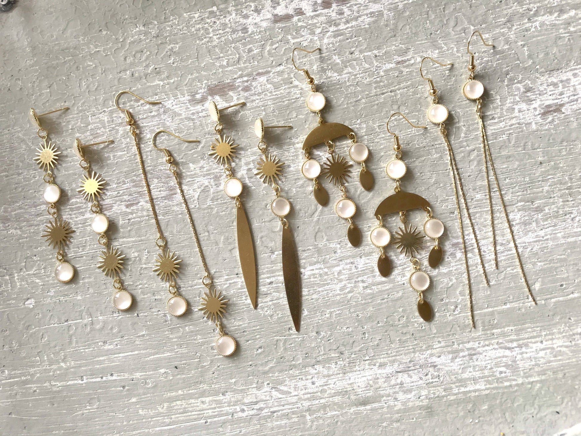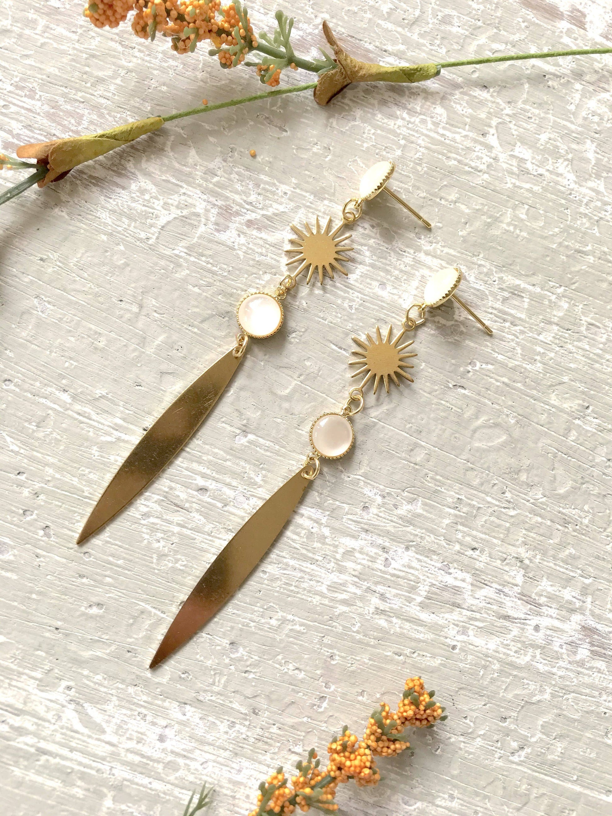 These are modern celestial statement earrings featuring raw brass star shapes, a raw brass pendant, and a white connector piece.